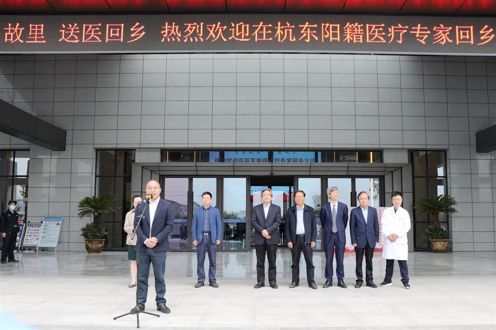 4月22日,东阳市卫健局党委书记、局长楼杰华在东阳中医院义诊活动开幕式上讲话