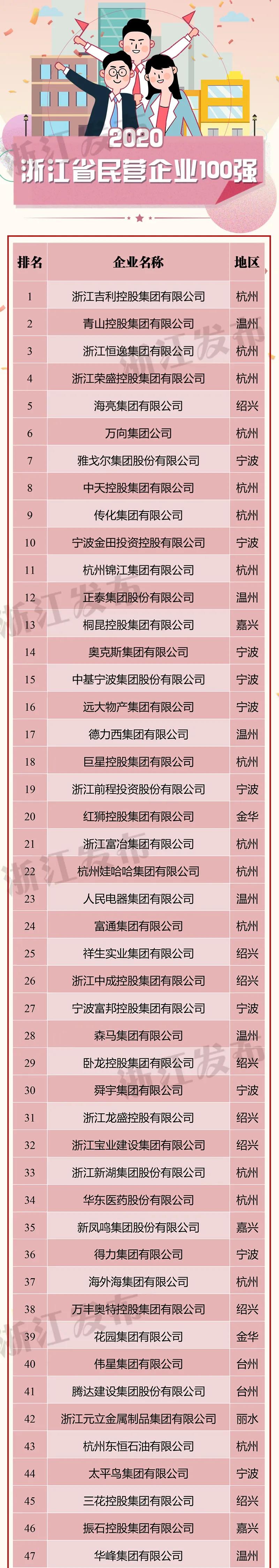 9月3日,省市场监管局、省工商联共同发布“2020浙江省民营企业100强”榜单。本次100强榜单根据企业提供的2019年度财务报表,以企业2019年度营业收入为主要依据,参考其当年净利润、净资产、纳税额等指标以及企业信用信息公示系统年报数据等进行排序。