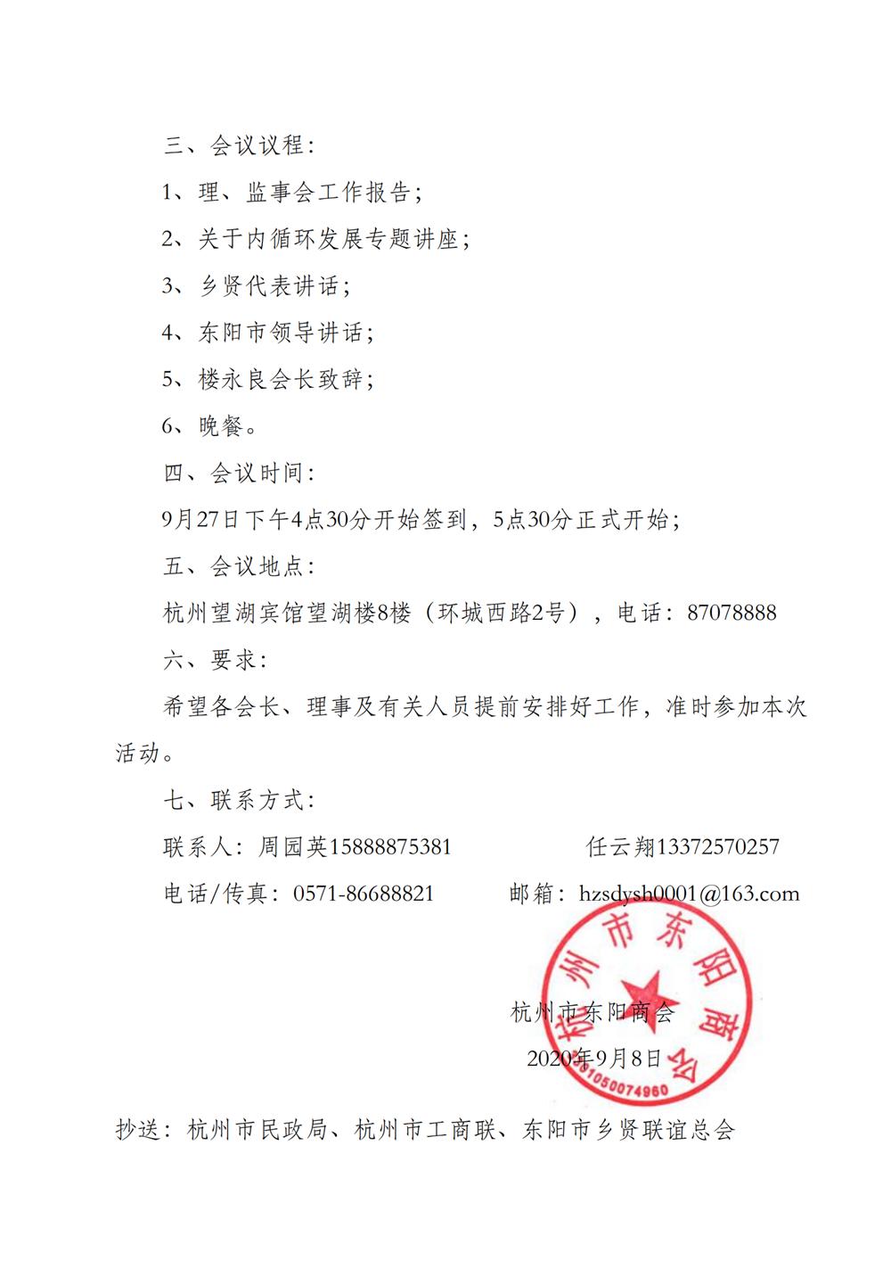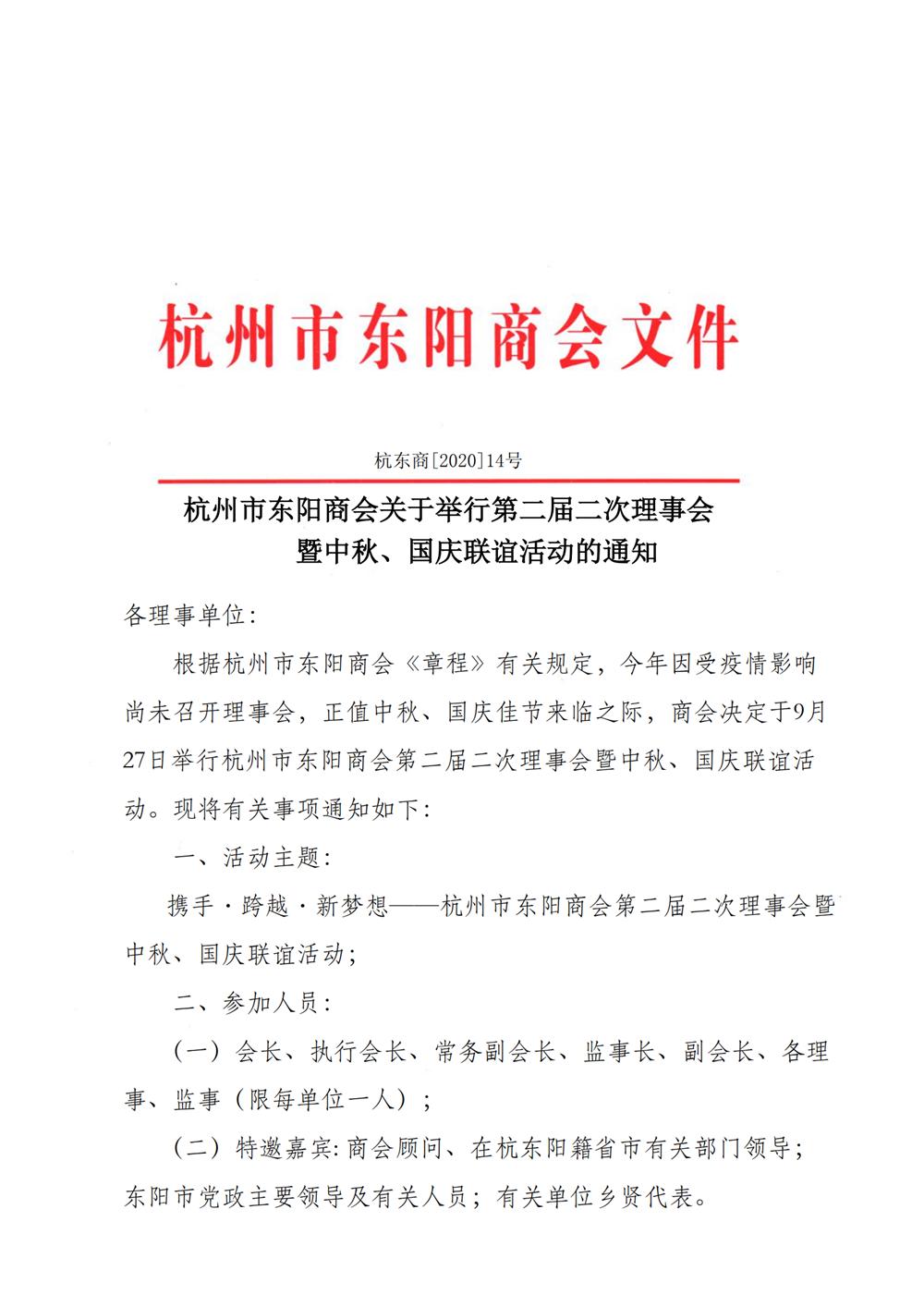 杭州市东阳商会关于举行第二届二次理事会暨中秋、国庆联谊活动的通知