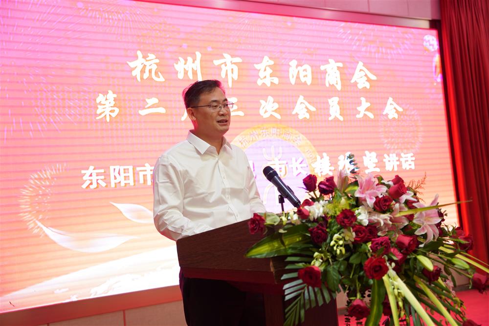 东阳市委副书记、市长楼琅坚作了重要讲话。他首先对杭州东阳商会2020年的工作和取得的成绩给予充分肯定,对一直以来关心支持家乡建设的在杭各贤表示感谢。然后介绍了东阳的发展情况和“十四五”时期争创现代化先行市的总目标以及打造“两市三地两园”的具体目标。他指出当下东阳发展态势良好,打造了良好的营商环境和生态环境,这些发展硕果得益于所有东阳人的共同努力,希望内外东阳人凝心聚力,汇聚成推动东阳高质量发展的磅礴力量,并殷切期望各位企业家在发展好自身事业的同时,能够常回东阳走走看看,多为家乡发展建言献策,欢迎回乡投资,最后寄望杭州东阳商会更好地服务乡亲、服务家乡,服务社会,把商会办得更加红火!
