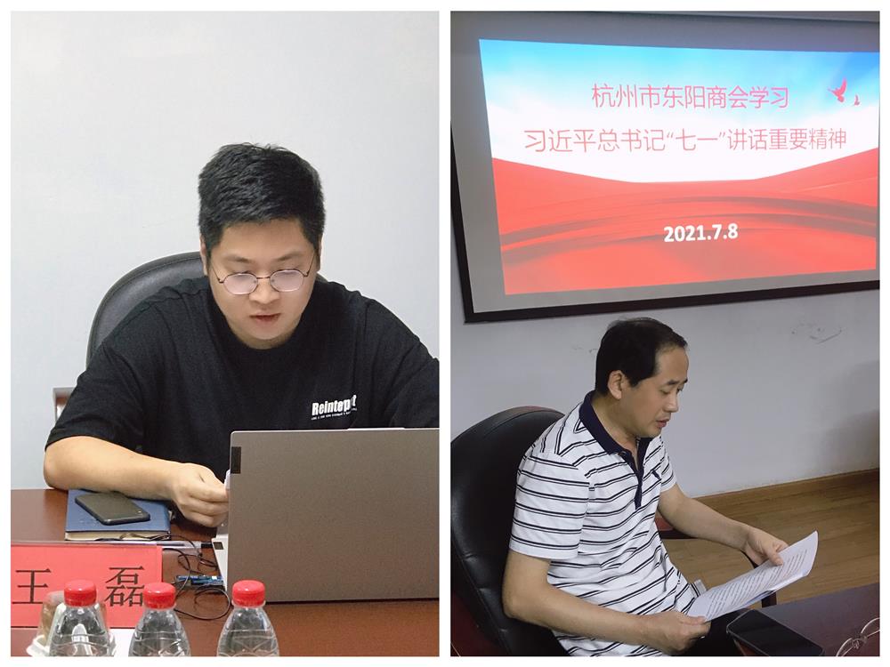 7月8日下午,杭州市东阳商会认真学习贯彻“习近平总书记在庆祝中国共产党一百周年大会上的重要讲话精神”专题会在浙江普华会计师事务所会议室举行。监事长施秀伟、副会长杜德韩、吴祖跃、李飞白、监事潘巧燕、理事楼洪海、陈鑫范、蔡琳红、会员金祖军等16人参加,学习活动由商会秘书长李惠兰主持。