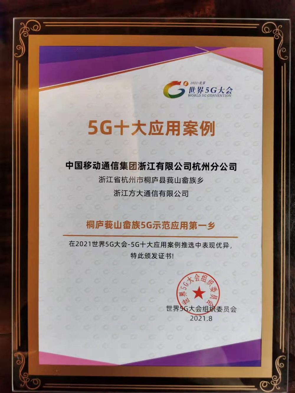 杭州市东阳商会理事单位浙江方大通信有限公司同中国移动杭州分公司、浙江大学张剑博士团队一起,在杭州市桐庐县莪山畲族乡共同打造的《桐庐莪山畲族5G示范应用第一乡》项目成功入选2021年世界5G大会十大应用案例!