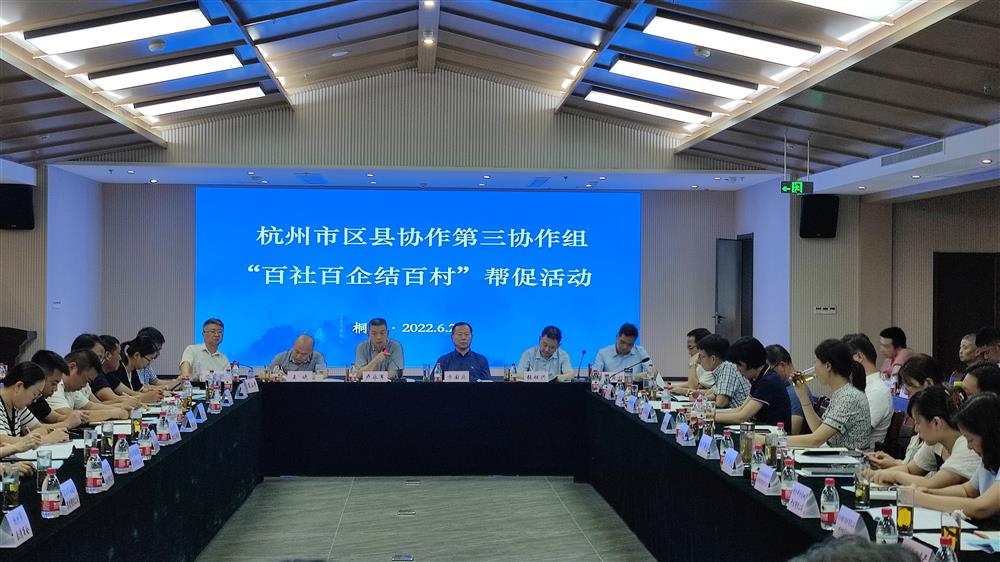 6月29日,杭州市东阳商会秘书处李惠兰、周园英等一行三人赴桐庐参加由杭州市区县(市)协作第三协作组开展的“百社百企结百村”帮促活动。杭州市工商联、桐庐县有关领导,滨江区、拱墅区共11个街道、15个经济合作社及杭州市13家国有企业、9家民营企业和6个商会的负责人及桐庐县5个乡镇、15个村的领导干部100多人参加了“三百”帮促活动。会议由桐庐县农业农村局党委委员、副局长施宇昕主持。