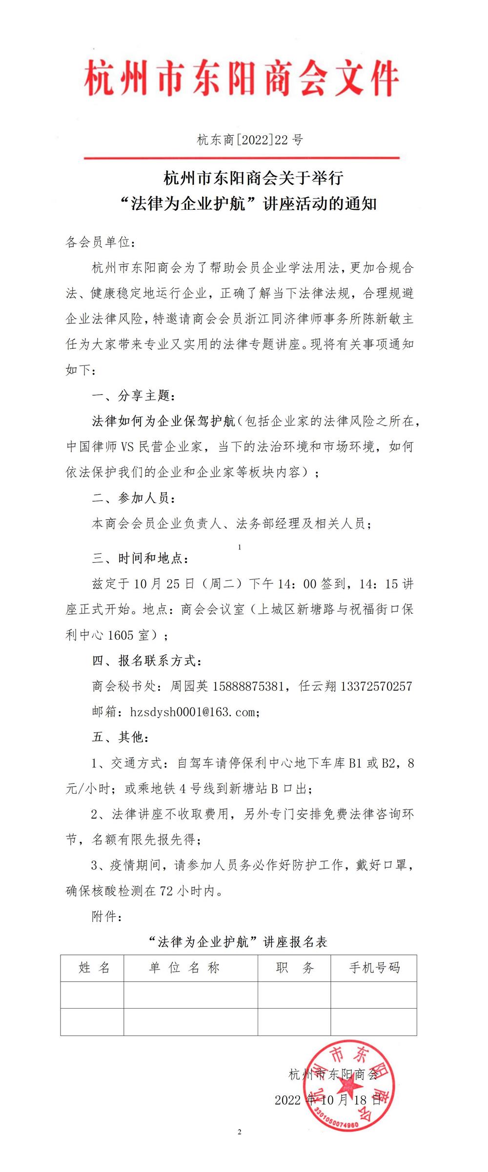杭州市东阳商会关于举行 “法律为企业护航”讲座活动的通知