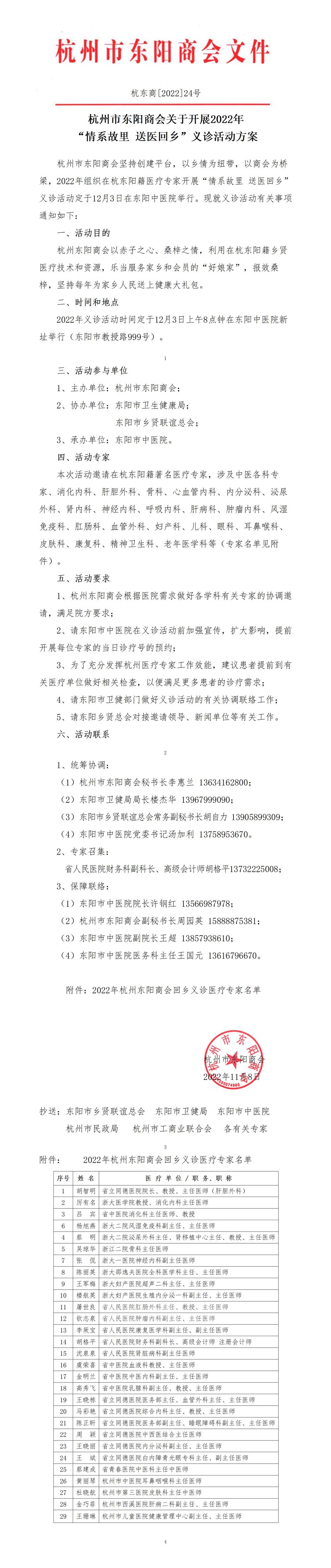 杭州市东阳商会关于开展2022年“情系故里 送医回乡”义诊活动方案