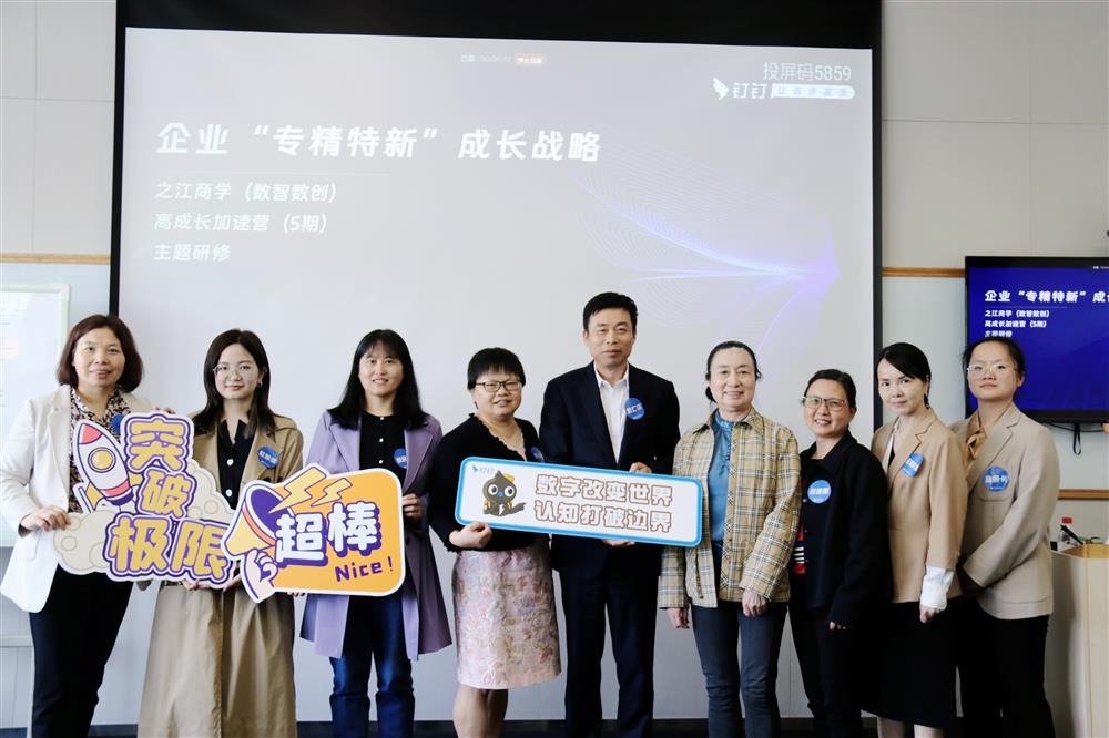 4月27日,杭州市东阳商会副会长、杭州康客科技有限公司总经理朱美芳、杭州永控科技有限公司总经理蔡琳红、浙江挚典科技有限公司副总经理杜妍蝶、杭州弘景贸易有限公司总经理任静蕙、杭州善上水科技有限公司总经理吕婷婷、秘书处李惠兰、周园英等8人走进阿里巴巴公司,参加了由之江商学举办的企业“专精特新”成长战略第五期高成长加速营学习培训。