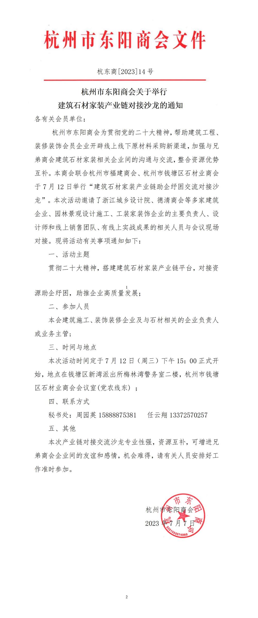 杭州市东阳商会关于举行建筑石材家装产业链对接沙龙的通知