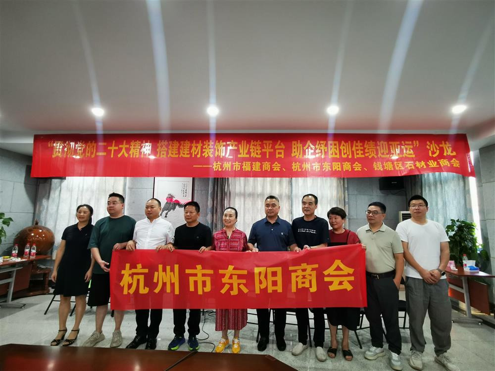 7月12日下午,杭州市东阳商会联合杭州市福建商会、钱塘区石材业商会举办了“助企纾困创佳绩迎亚运”建筑石材产业链对接沙龙。本商会副会长单位筑工科技杜德韩、理事单位东方龙建设陈飞龙、杭坤建设周国栋及广众建设郭友权、君豪装饰何军明、港盛建设刘海港等董事长亲自参加,还有中天建设、歌山建设、银建装饰、浙一建八分等单位分管领导或业务代表共15人参加活动。杭州市福建商会、钱塘区石材业商会会员及相关产业代表等60多人参加,活动由杭州市福建商会秘书长钱永祥主持。