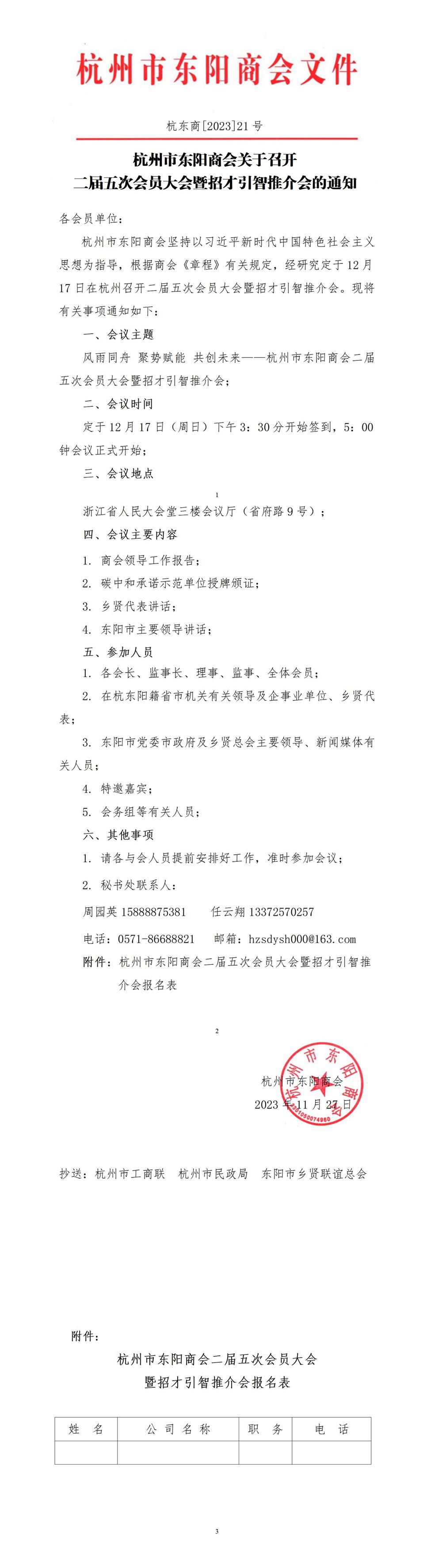 杭州市东阳商会关于召开二届五次会员大会暨招才引智推介会的通知