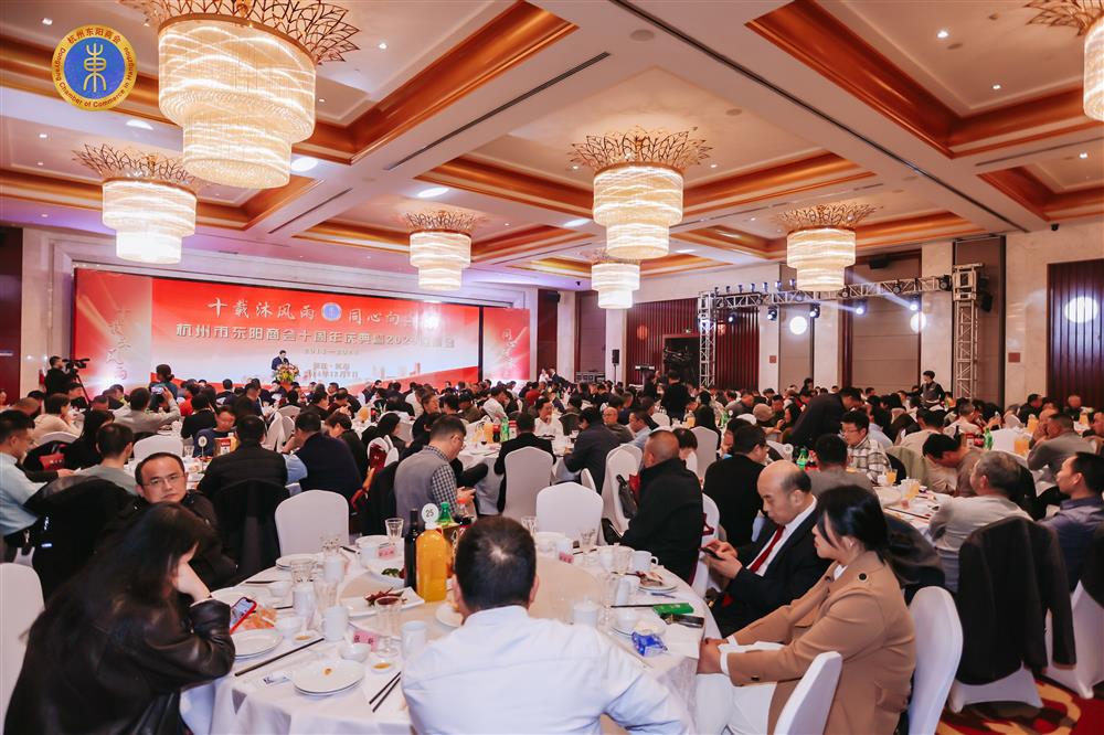 12月7日下午,十载沐风雨 同心向未来——杭州市东阳商会十年庆典暨2025迎新会在西子湖畔隆重举行。出席本次大会的主要领导有浙江省人大常委会原副主任励志海,省交通运输厅厅长蔡洪,杭州市副市长陈卫强,杭州市政协副主席、市工商联主席冯仁强,东阳市委书记楼琅坚,东阳市人大常委会党组书记、主任朱志杰,东阳市政协党组书记、主席方宪文,东阳市政协原主席、市乡贤联谊总会会长王正明,东阳市委常委、常务副市长郭锦明,东阳市委常委、统战部部长张伟钢等领导;大会还邀请了在杭东阳籍省、市机关有关领导及企事业单位老乡代表;杭州市工商联、民政局、金华驻杭办、八婺商会等特邀嘉宾;商会各会长、理事、会员等共380人欢聚一堂,回顾商会发展历程,畅叙桑梓情谊,共话家乡发展。