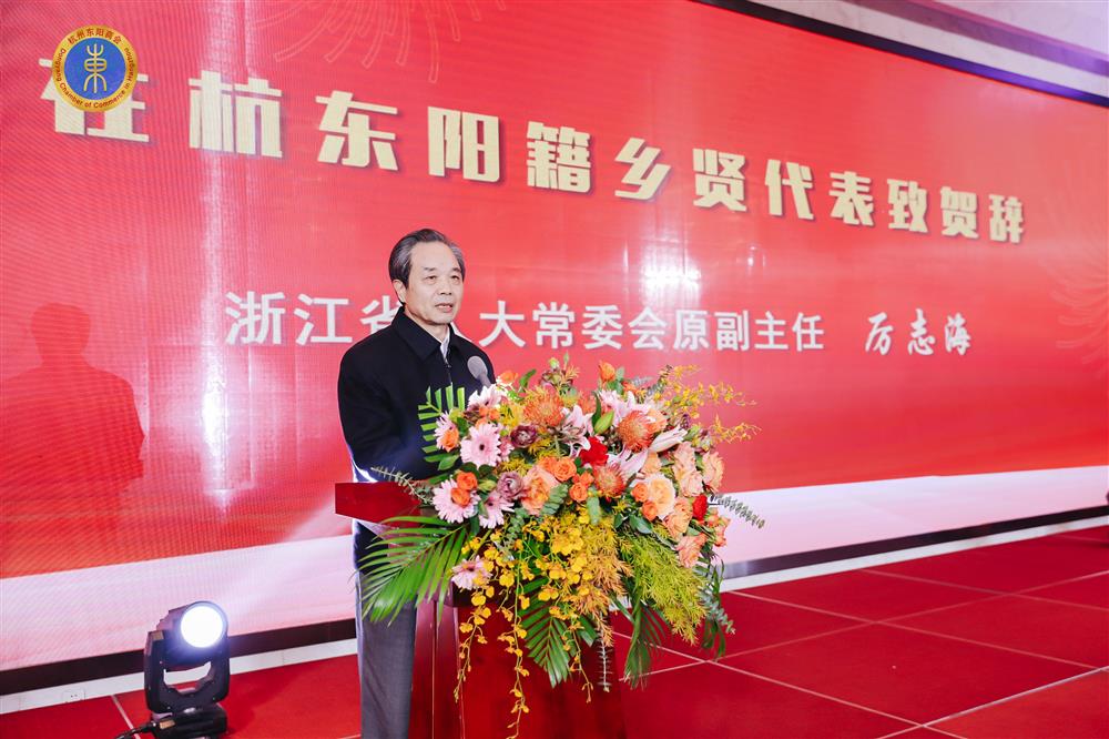 浙江省人大常委会原副主任厉志海致贺词。首先向杭州市东阳商会成立十周年表示热烈祝贺。他说,杭州市东阳商会坚持以“创建平台、服务会员、精诚团结、合作共赢”为宗旨,充分发挥桥梁纽带和服务平台的作用,开展了形式多样、内容丰富的活动,为助推会员企业高质量发展,促进杭州、东阳两地合作共赢作出了突出贡献。这十年,是商会不断创新、务实奋进、业绩辉煌的十年。新的一年,希望商会会员企业增强信心、保持定力,稳中求变、稳中求进,夯实基础、以实抗压,提升竞争力、可持续发展能力;希望商会继续发挥服务平台作用,切实为企业解决实际问题,为企业高质量发展助力。