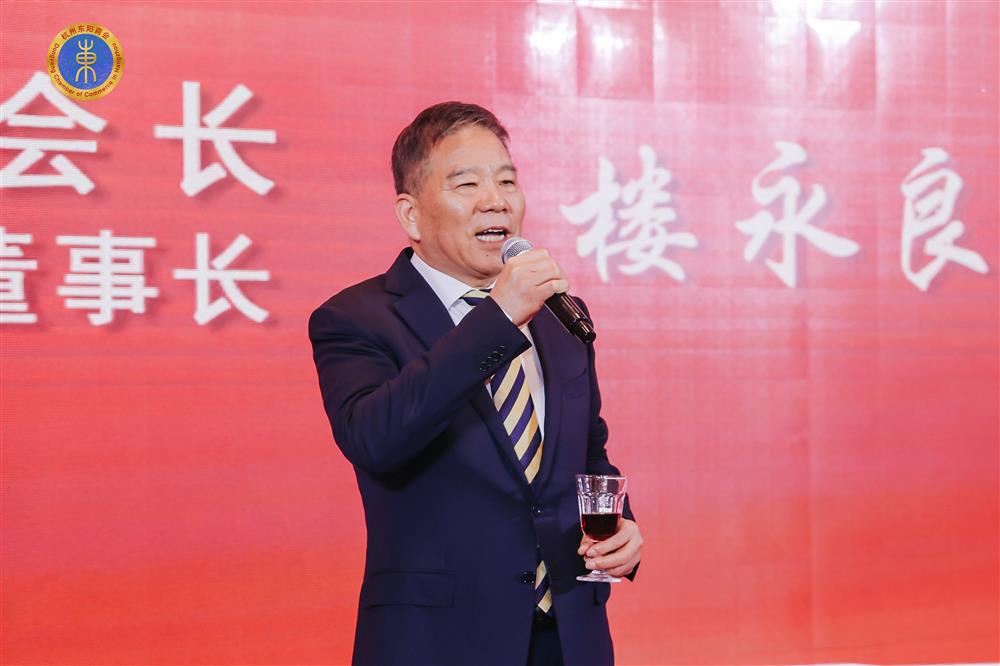 商会会长、中天控股集团董事长楼永良发表了热情洋溢的祝酒辞。他说商会成立十年间,商会和企业享受到了宏观经济快速增长的红利,取得了显著进步。商会对此深感自豪,并在此特别感谢各级领导及社会各界的支持与关心。当前全球经济环境复杂多变,国内经济亦面临下行压力,商会及会员企业在发展过程中感受到了前所未有的挑战与困难。大家坚信,正是这些挑战塑造了企业家的坚韧与智慧,激发了勇于担当、敢于创新的拼搏精神。楼会长鼓励所有会员,要对企业创造财富、推动社会进步、服务民生福祉的崇高使命充满自豪,以坚定的底气和无畏的勇气面对困难,把握机遇,持续发展。最后,楼会长对在座的每一位嘉宾和企业家致以最诚挚的祝福。