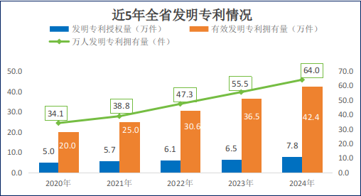截至2024年底,全省有效发明专利拥有量达42.4万件,每万人发明专利拥有量达到63.98件,同比增长15.3%;高价值发明专利拥有量达15.3万件,全国排名上升至第4位,同比增长27.4%。