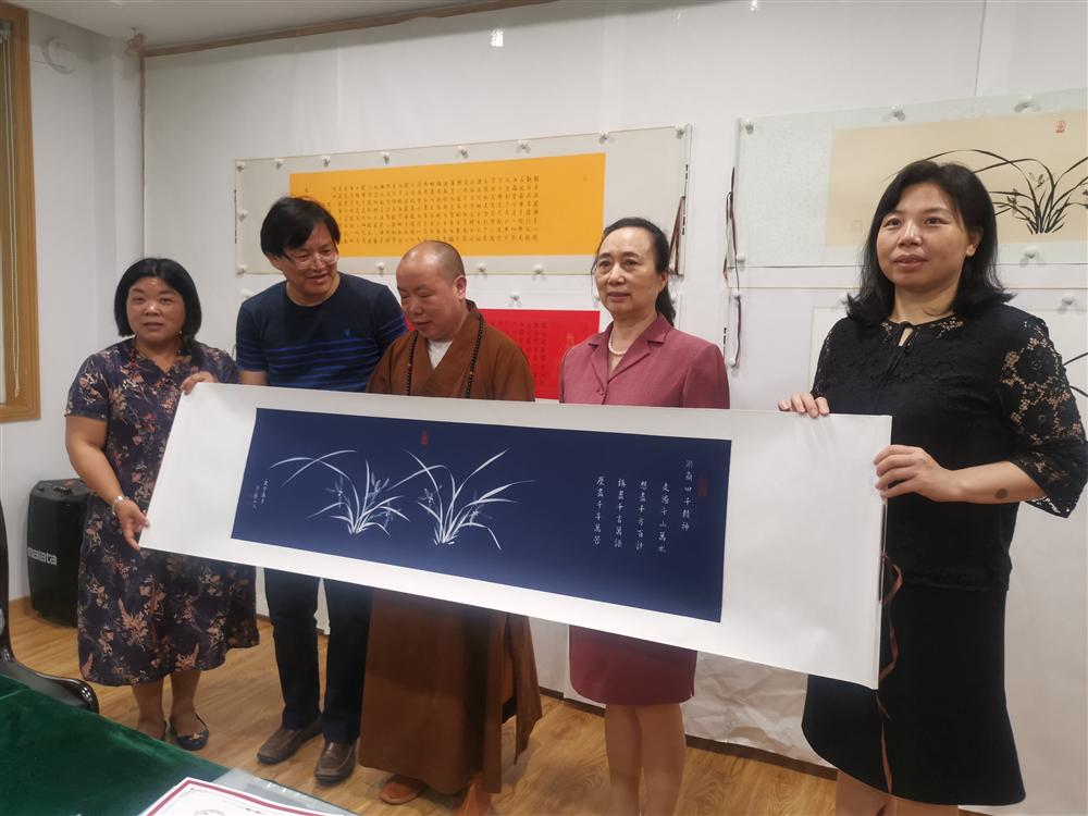 最后,现场给各位参加仪式的单位分别捐赠墨宝,本商会收到昌兴法师的心经和兰花各一副,当场回馈捐赠证书,以致感谢。